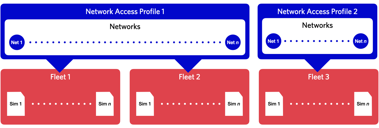 Each Fleet is assigned a Network Access Profile resource. A Network Access Profile (NAP) essentially defines a collection of cellular networks which the Fleet's Sims are permitted to access. Again, you can use as many or as few (you need at least one) NAPs as you need. A given Fleet can use only one NAP at a time, but a single NAP can be shared by multiple Fleets simultaneously: